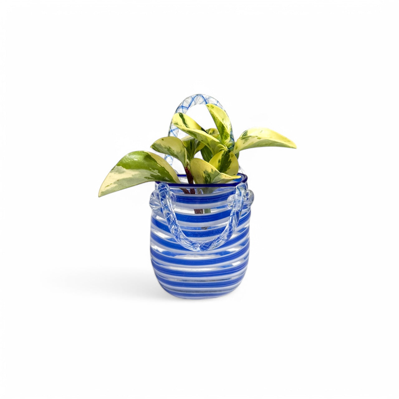 Vintage Hand Blown MCM Style Cobalt Swirl Detailed Handles Glass Purse Art Vase