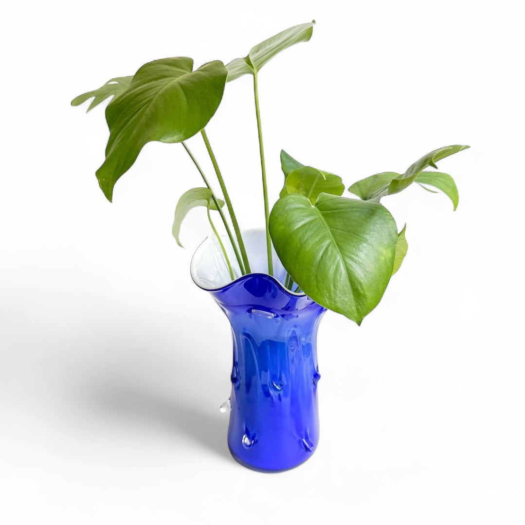 Vintage MCM Murano Style Cobalt Blue White Cased Pulled Glass Drop Design Waved Rim Glass Art Vase