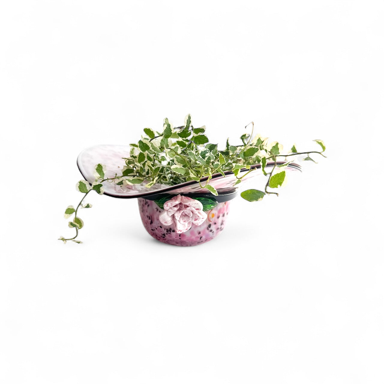 Vintage Murano Style Hand Blown Speckled Frit Torched Rose Wrap Glass Hat Art Vase