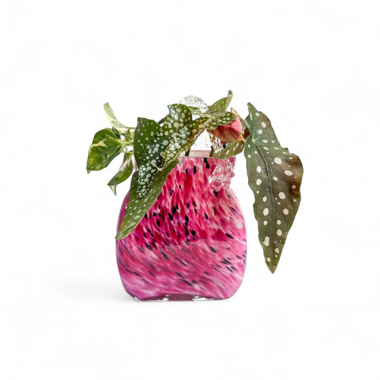 Vintage Hand Blown Murano Style Bright pink & Black Speckled Frit Design With Clear Hand Pulled Handles Glass Art Purse
