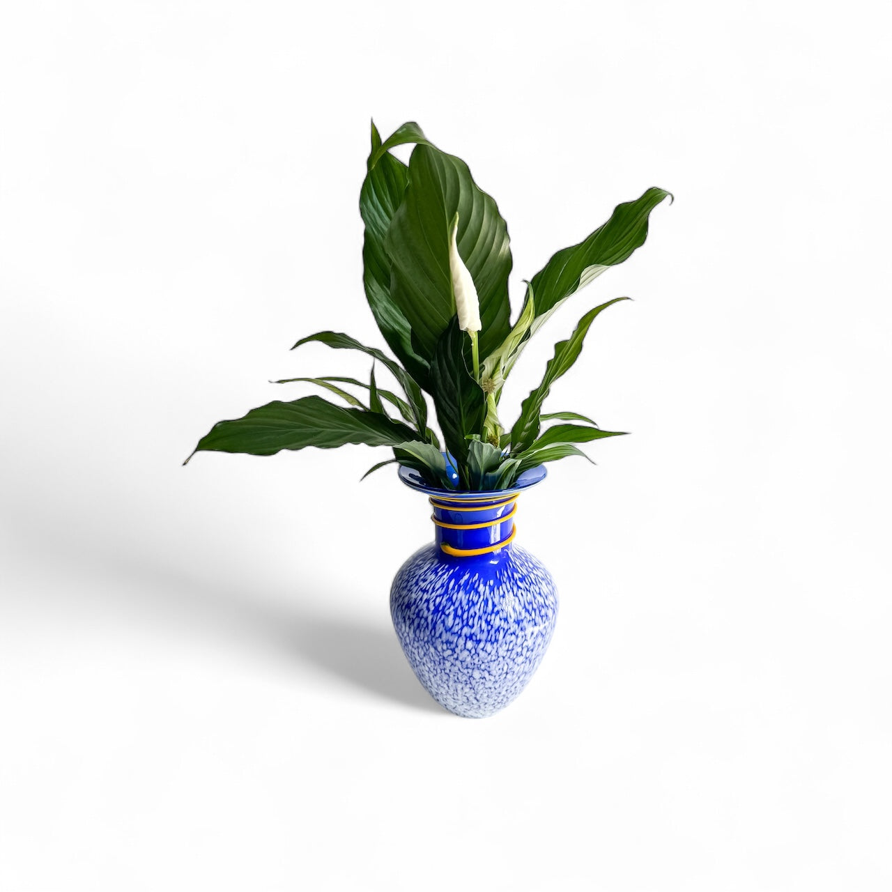 Hand Blown Blue With White Frit & Yellow Swirl Pulled Cane Glass Art Vase