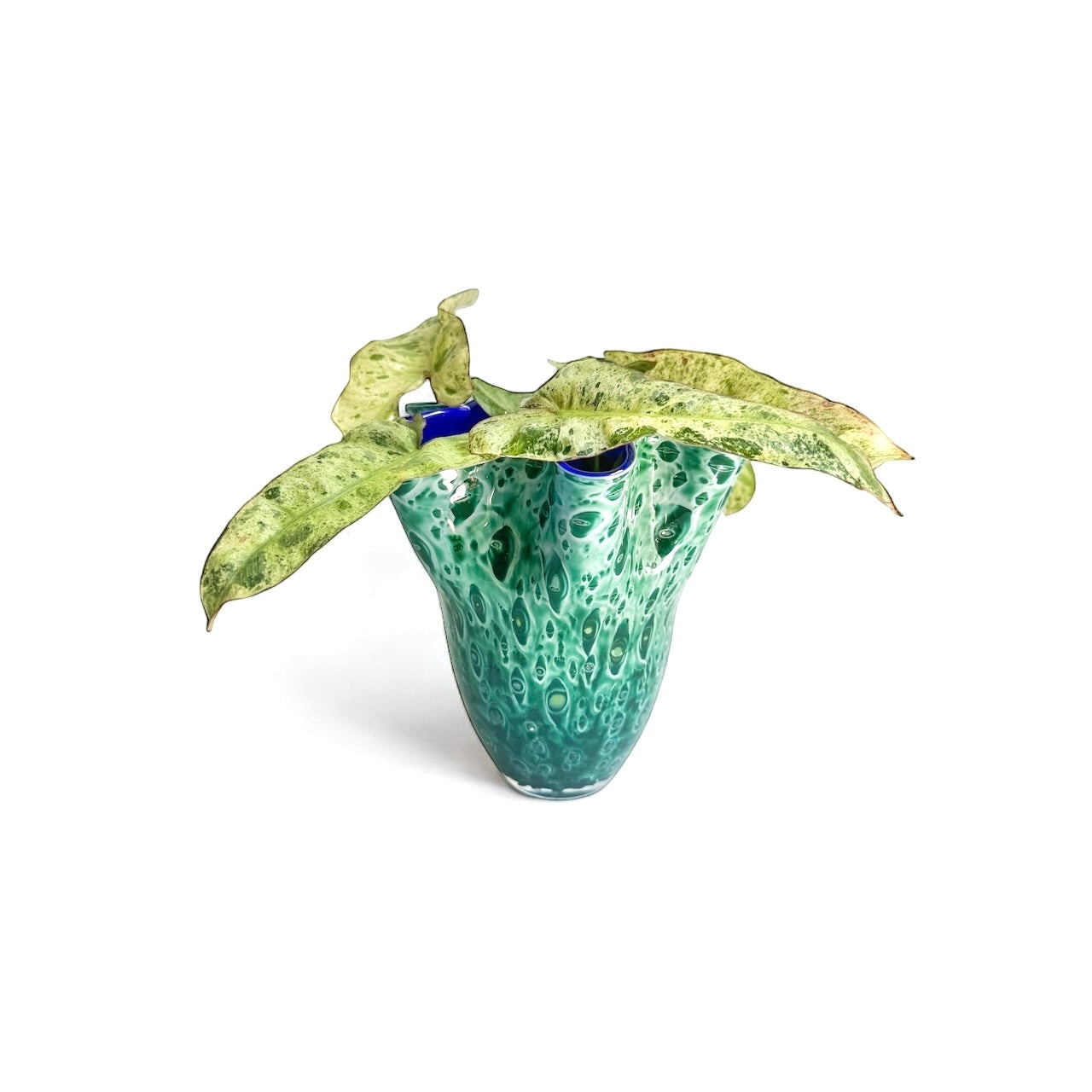 Vintage Hand Blown MCM Ruffled Handkerchief Rim Turquoise & Blue Peacock Spot Design Glass Art Vase