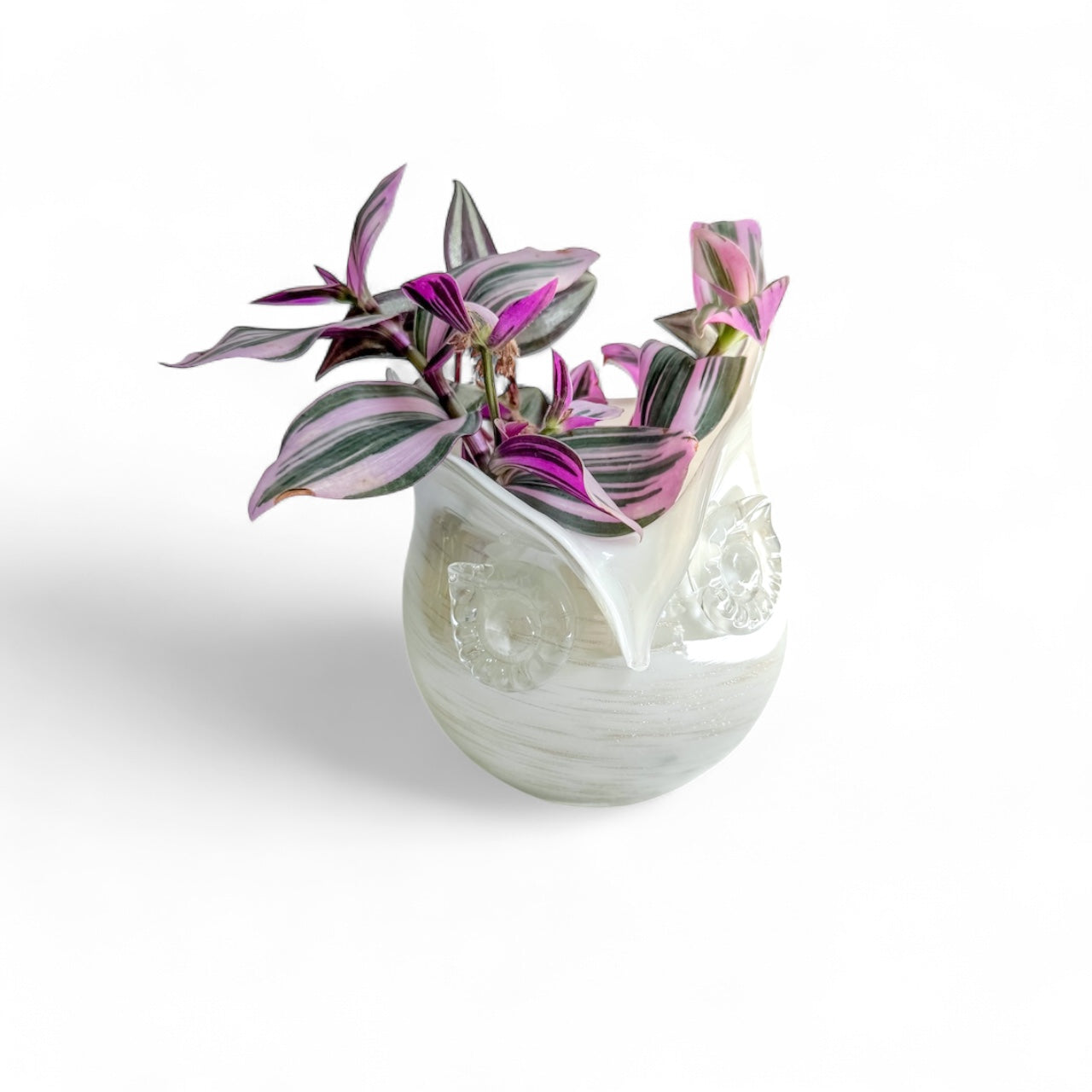 Vintage Hand Blown White With Torch Work Eyes Glass Art Owl Vase